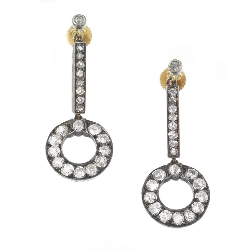 in oro e argento, da cui pendono due elementi a cerchio impreziositi da diamanti taglio vecchio per ct 4 circa, chiusura a vite, dim. cm 2x4,5, gr. 10 complessivi