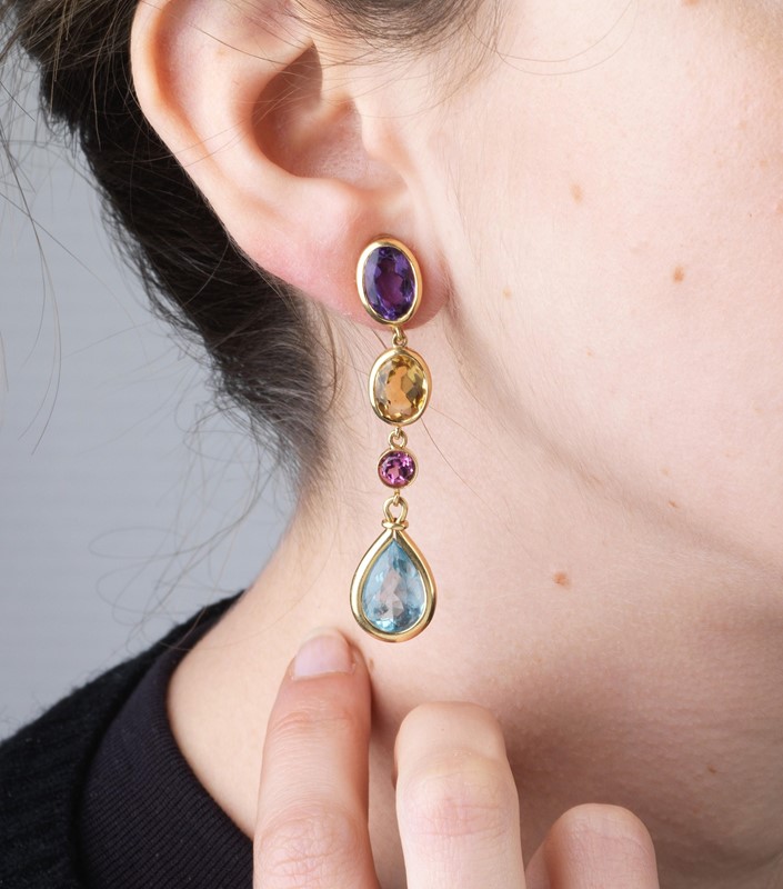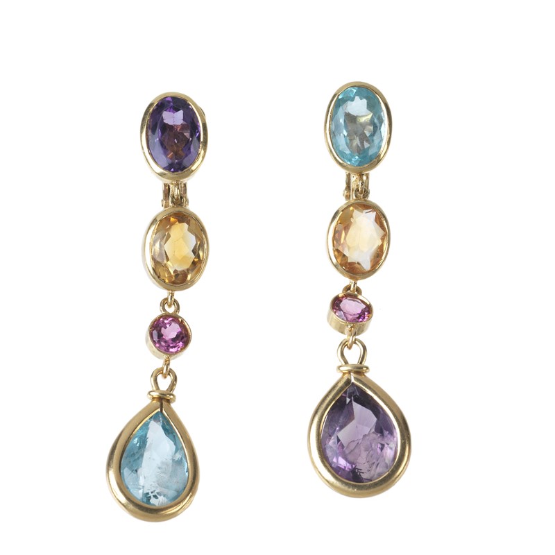 PAIO DI ORECCHINI PENDENTI CON PIETRE SEMIPREZIOSE in oro giallo 18kt, impreziositi da quarzi citrini, ametiste e tormaline taglio fantasia, chiusura a clip, dim. cm 1x5,5, gr. 17 complessivi