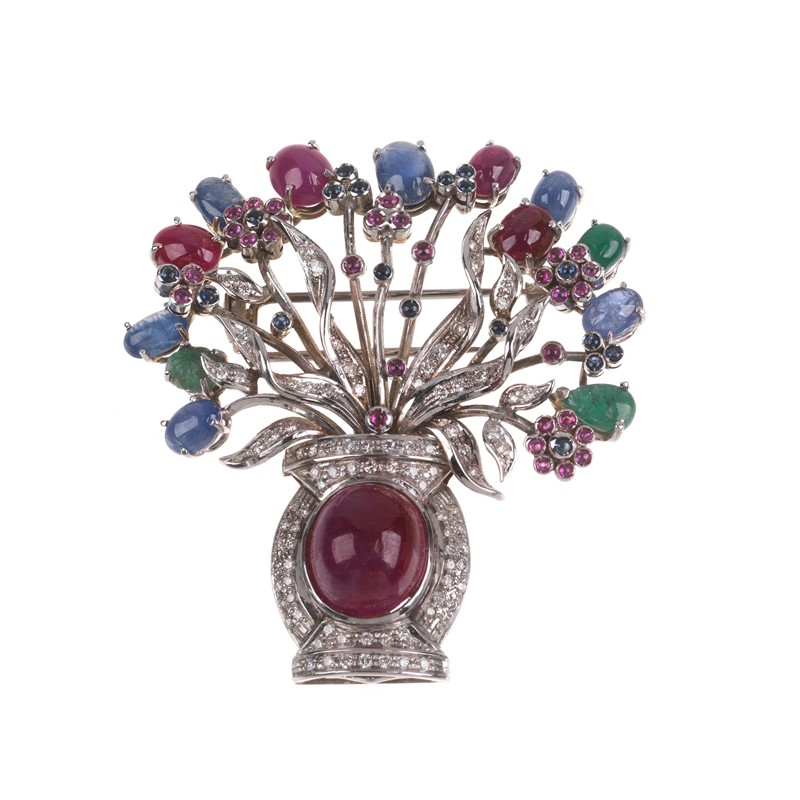 SPILLA A CESTO FIORITO CON PIETRE DI COLORE E DIAMANTI in oro bianco 18kt, impreziosito da rubini, zaffiri e smeraldi taglio cabochon per ct 28 circa, dim. cm 5,5x6, gr. 37 circa