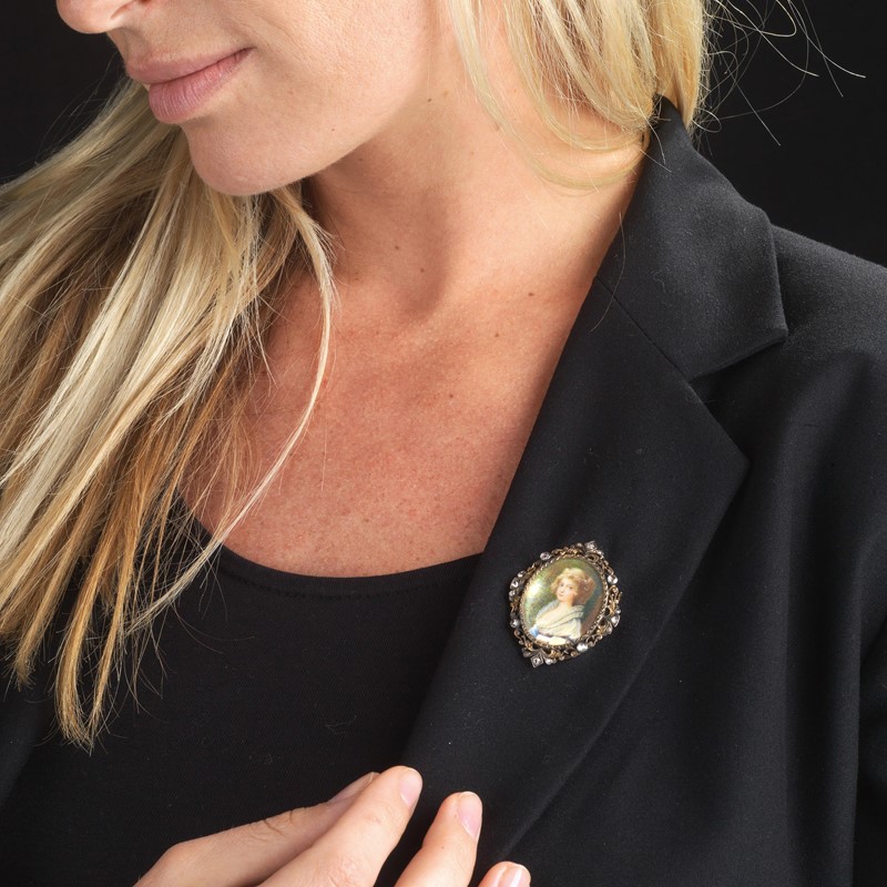 SPILLA CON MINIATURA in argento, al centro una miniatura in smalti policromi, raffigurante una giovane donna entro cornice a tralci impreziositi da rose di diamante, dim. cm 3,5x4, gr. 11