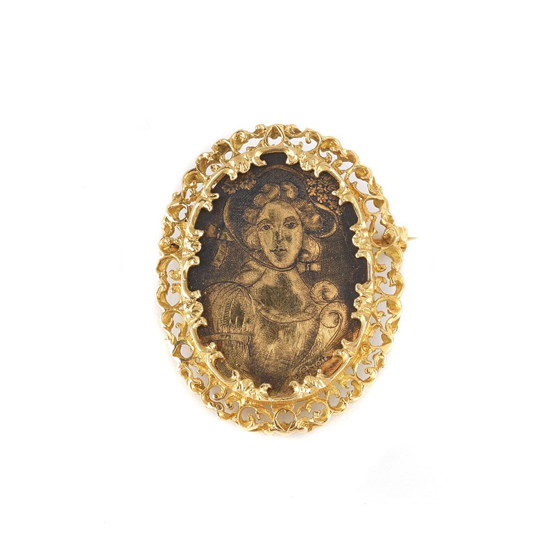SPILLA RAFFIGURANTE UNA DONNA CON CAPPELLO in oro giallo 18kt, composta da una cornice di ghirlande con al centro raffigurata una donna con cappello, punzoni 750 e del fabbricante, dim. cm 3x3,5, gr. 11