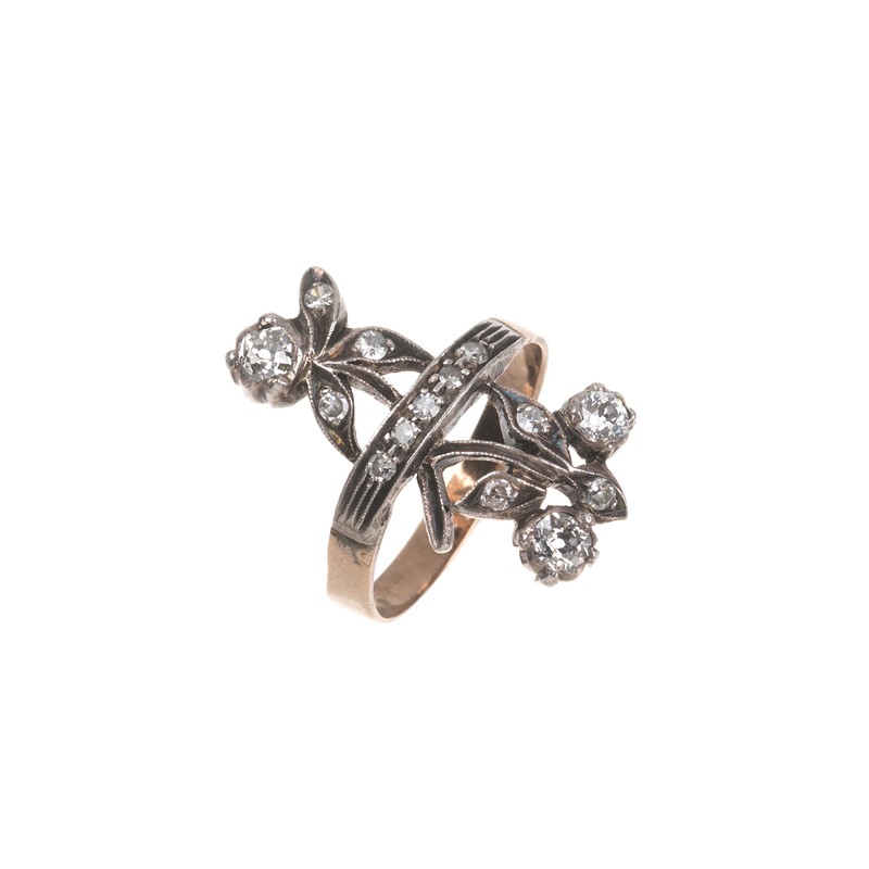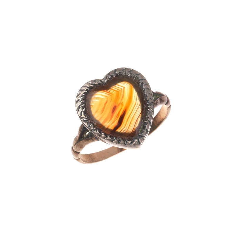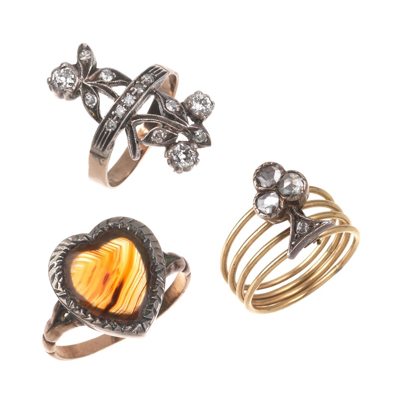 TRE ANELLI CON DIAMANTI E CALCEDONIO in oro e argento, di cui uno a forma di cuore, con al centro un calcedonio, mis. 57, accompagnato da un secondo anello a forma di tralci, impreziosito da diamanti taglio vecchio per ct 0.60 circa, mis. 52, ed infine un terzo anello composto da quattro cerchi uniti da un elemento a forma di trifoglio con pietre incolore, gr. 7 complessivi circa