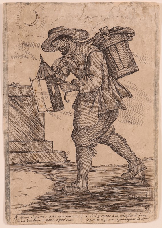 Reca la scritta: A spasso il giorno: e che rara fortuna / [se] un venditor di poma e pere cotte / Il Ciel promette à lo splendor di luna / se perde il giorno il guadagnar la notte.