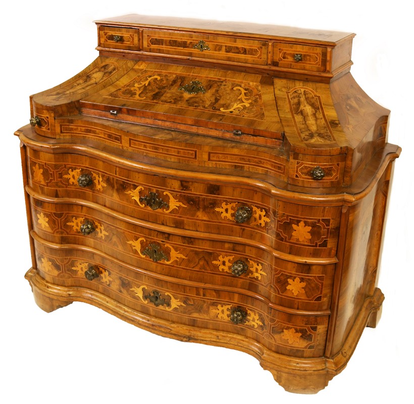 Cassettone a ribalta lastronato e intarsiato in legno di radica e noce
