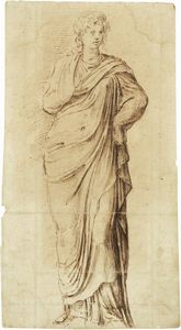 Penna e acquerello bruno su carta, mm. 205x290 Reca sul recto in basso al centro l'iscrizione a matita: Santi. [..]