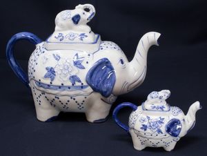 Due teiere in porcellana bianco blu a forma di elefante