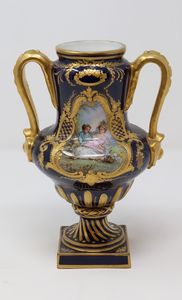 Piccola anfora biansata in porcellana blu e oro