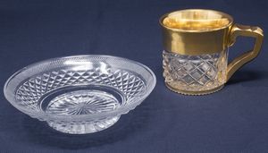 Tazzina in cristallo molato e dorato con piattino in cristallo molato