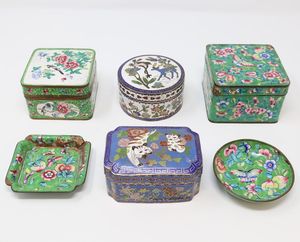 Quattro cofanetti e due piattini in smalto