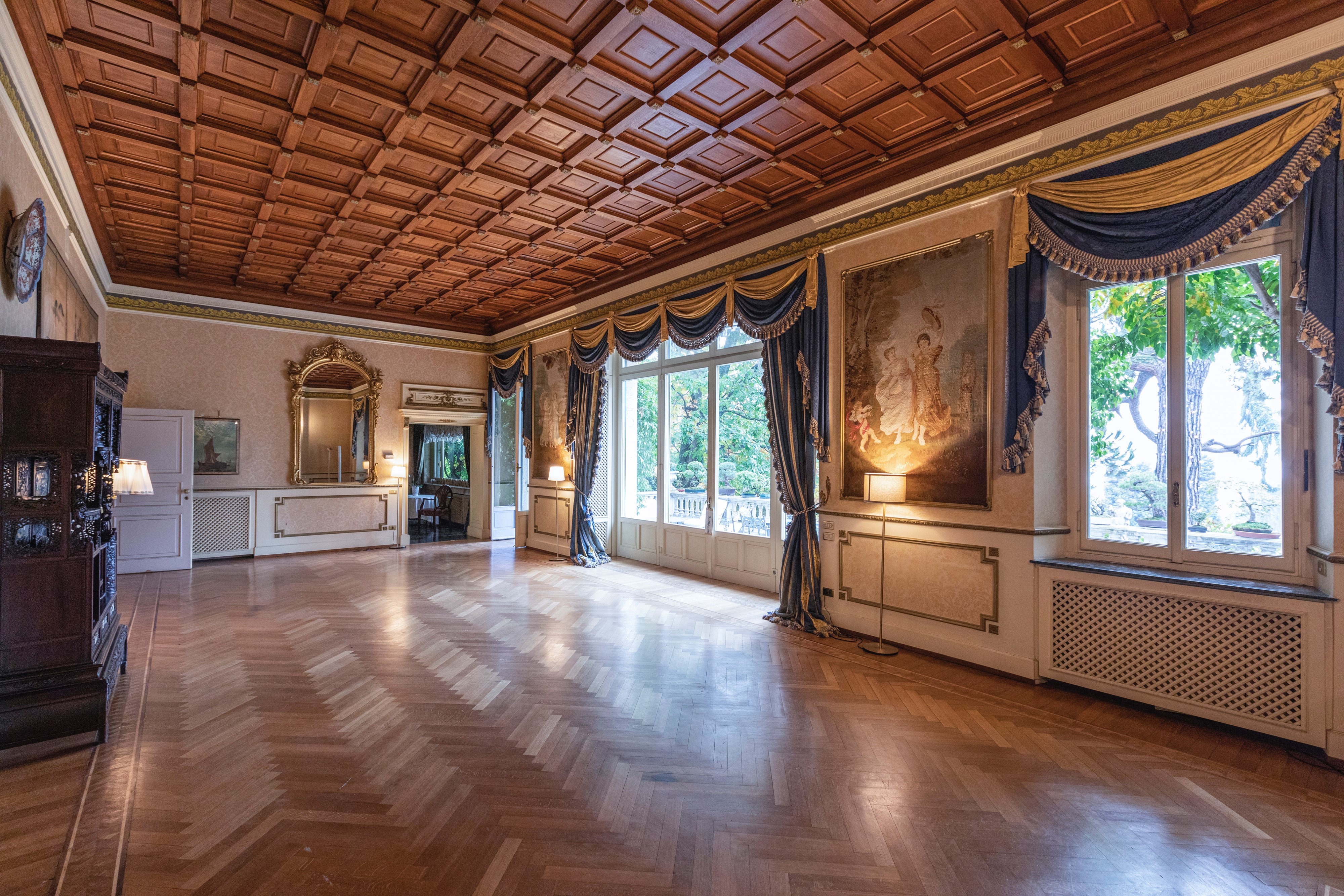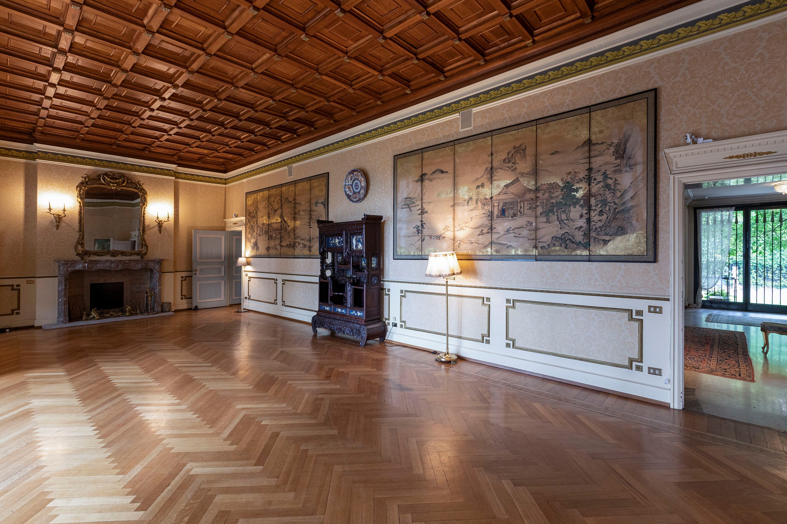 Questa grandissima stanza, completamente rifatta, comprende un soffitto in boiserie primi ‘900, un camino di grandi dimensioni in marmo rosa screziato, originale francese Louis XV, due specchi contrapposti di grandi dimensioni. Le grandi finestre si aprono sul terrazzo e sulla balconata sopra il giardino, con vista mozzafiato. Alle pareti sono presenti due paraventi giapponesi rarissimi, di grandi dimensioni, del ’500.