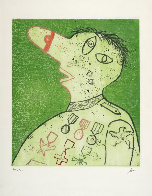 Acquatinta. mm 410x355. Foglio: mm 590x440 (visibili). Firma a matita in basso a destra e "H.C" in basso a sinistra.