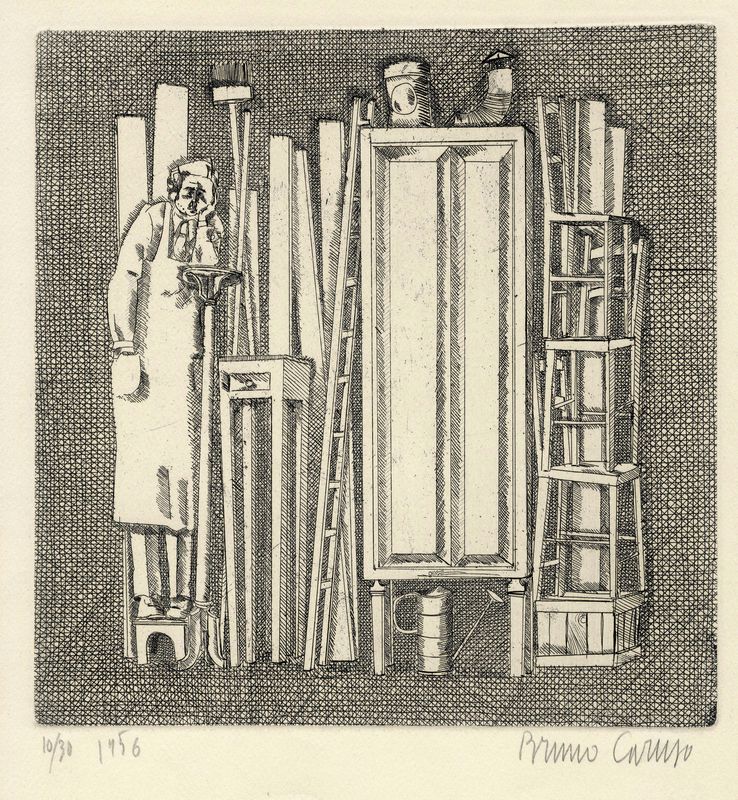Acquaforte. mm 250x195. Foglio: mm 500x355. Firma a matita in basso a destra e tiratura in basso a sinistra. Timbro de "Graphis Club" al verso. Es. 115/150. SI AGGIUNGE: 2) Bruno Caruso, Metafisica. 1956. Acquaforte. mm 280x270. Foglio: mm 440x350. Firma a matira in basso a destra e tiratura in basso a sinistra. Al verso timbro de "Il torcoliere Stamperia d'arte". Es. 10/30.