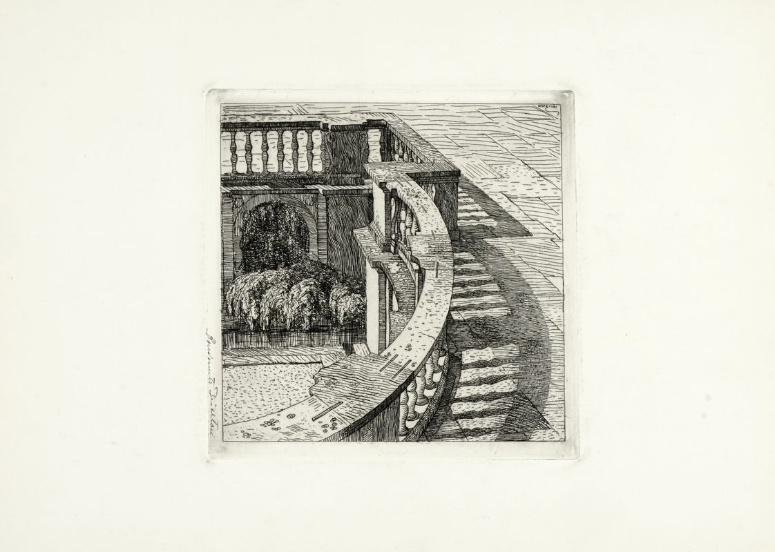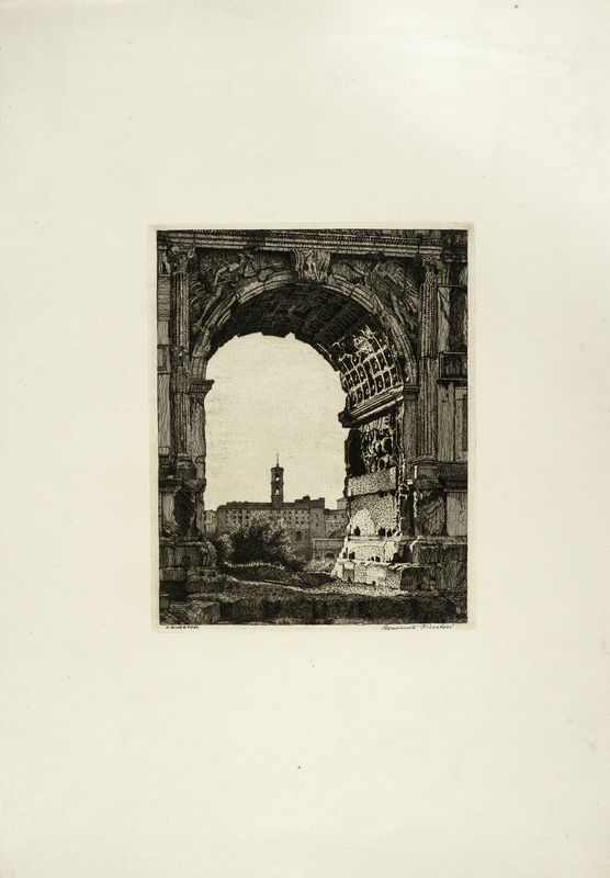 1) La fontana nella villa di Papa Giulio a Roma. 1917 circa. Acquaforte. Inciso: mm 205x200. Lastra: mm 224x216. Foglio: mm 350x500. bellini-alberti, 26. Firmata a penna a sfera in basso a sinistra. 2) L'arco di Tito. 1918. Acquaforte e bulino. Inciso: mm 291x225. Lastra: mm 298x238. Foglio: mm 670x485. bellini-alberti, 32. Firmata a penna e inchiostro di china in basso a destra. 3) Monte Magnanapoli. 1918. Acquaforte e bulino su carta rosata. mm 292x380. Foglio: mm 430x618. bellini-alberti, 30. Firmata a penna a sfera in basso a destra, siglata e datata in lastra in basso. Al verso timbro de "Prof. Benvenuto Disertori". Provenienza: Eredi Disertori.