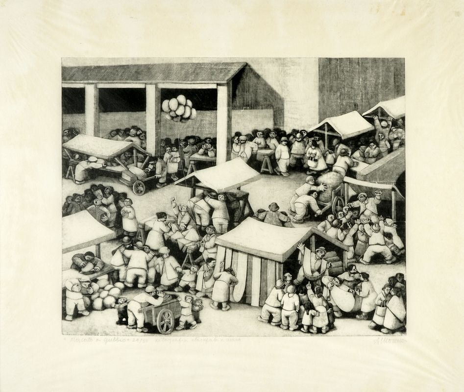 Xilografia su velina. mm 340x420. Foglio: mm 500x600 (visibili). Firma a matita in basso a destra, titolo, tiratura e tecnica in basso a sinistra. Es. 24/30.