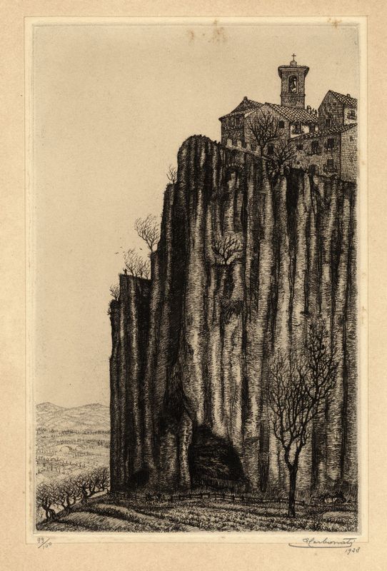 Cartella in folio (mm 430x320). Contenente frontespizio, indice e 6 acqueforti originali sciolte montate in passe-partout editoriali. Titoli: Panorama, Piazza del Municipio, Duomo, Palazzo del Popolo, La Torre del Moro, Le Rupi di San Giovenale. Tutte le incisioni sono firmate a matita, datate 1928 e numerate "99/100". Legatura in cartonato editoriale.