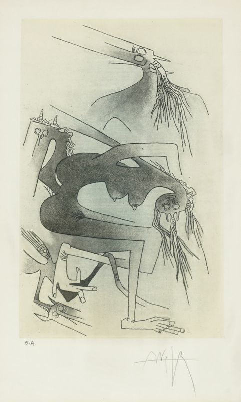 Acquaforte. mm 310x195. Foglio: mm 400x250 (visibili). Firma amatita in basso a destra ed "E.A" in basso a sinistra. Bellissima prova d'artista.