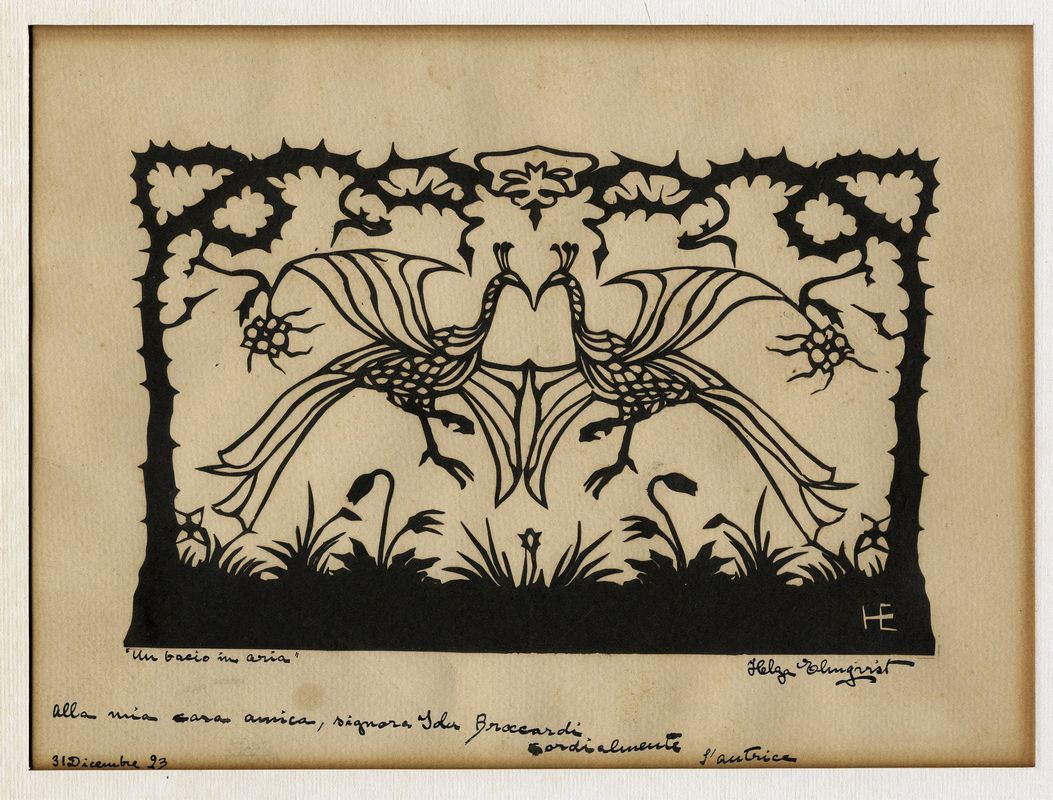 Silhouette in carta nera realizzata con la tecnica del decoupage e incollata su cartoncino. mm 205x285. Monogrammata, firmata e dedicata a penna. Preziosa opera appartenente alla tipologia di illustrazioni definite ricami in punta di forbice che Helga Elmquist eseguiva a Firenze con la sorella Idina negli anni Venti ed espose anche alla mostra degli illustatori e decoratori del libro nel 1922. Helga era figlia dello scultore Hugo Elmqvist e dell'artista Erna Wichmann e sorella di Idina Elmqvist-Christiansen e del fonditore d'arte Orvar Elmqvist. Si era poi sposata con il professore Giovanni Cau e risiedeva a Firenze. Per sfuggire ai combattimenti durante la seconda guerra mondiale, la coppia lasciò la città e si recò nella loro tenuta di campagna a Civitella ad Arezzo. Il soggiorno non fu del tutto privo di problemi perché i partigiani sospettarono che Helga fosse una spia poiché a volte veniva assunta come interprete. Successivamente la coppia fu accusata dai tedeschi di collaborare con la resistenza, tra l'altro, a causa di servizi di interpretariato per i partigiani. Durante la loro permanenza a Civitella, tre soldati tedeschi furono uccisi, e per rappresaglia furono uccisi 244 civili, tra cui Helga Elmqvist-Cau e Giovanni Cau, su ordine del capitano Heinz Barz della Divisione Hermann Göring. Nel marzo 1950 i corpi dei coniugi Cau furono ritrovati in un fosso in località Fornace Focardi presso Monte San Savino.