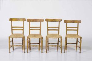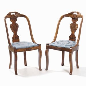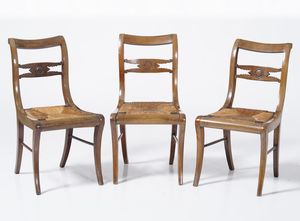 Gruppo di tre sedie con schienale a cartella intagliata,