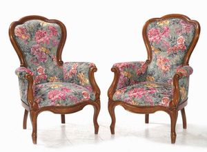 Coppia di poltrone in legno rivestite in tessuto a motivi floreali
