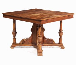Largh. 145 - Prof. 67 - Alt. 87 cm Gambe scolpite a volute, terminanti a ricciolo e riunite da traversa centrata [..]