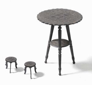 Lotto composto da un tavolino e due piccoli reggi vaso in legno ebanizzato e int [..]