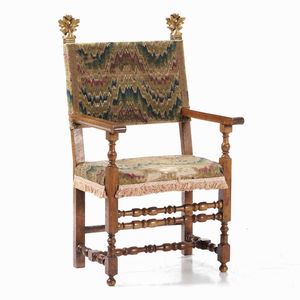 Seggiolone in noce tornito a rocchetto. Italia centrale XVII secolo