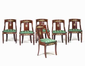 Sei sedie in legno con applicazioni di bronzi dorati e cesellati. XIX secolo
