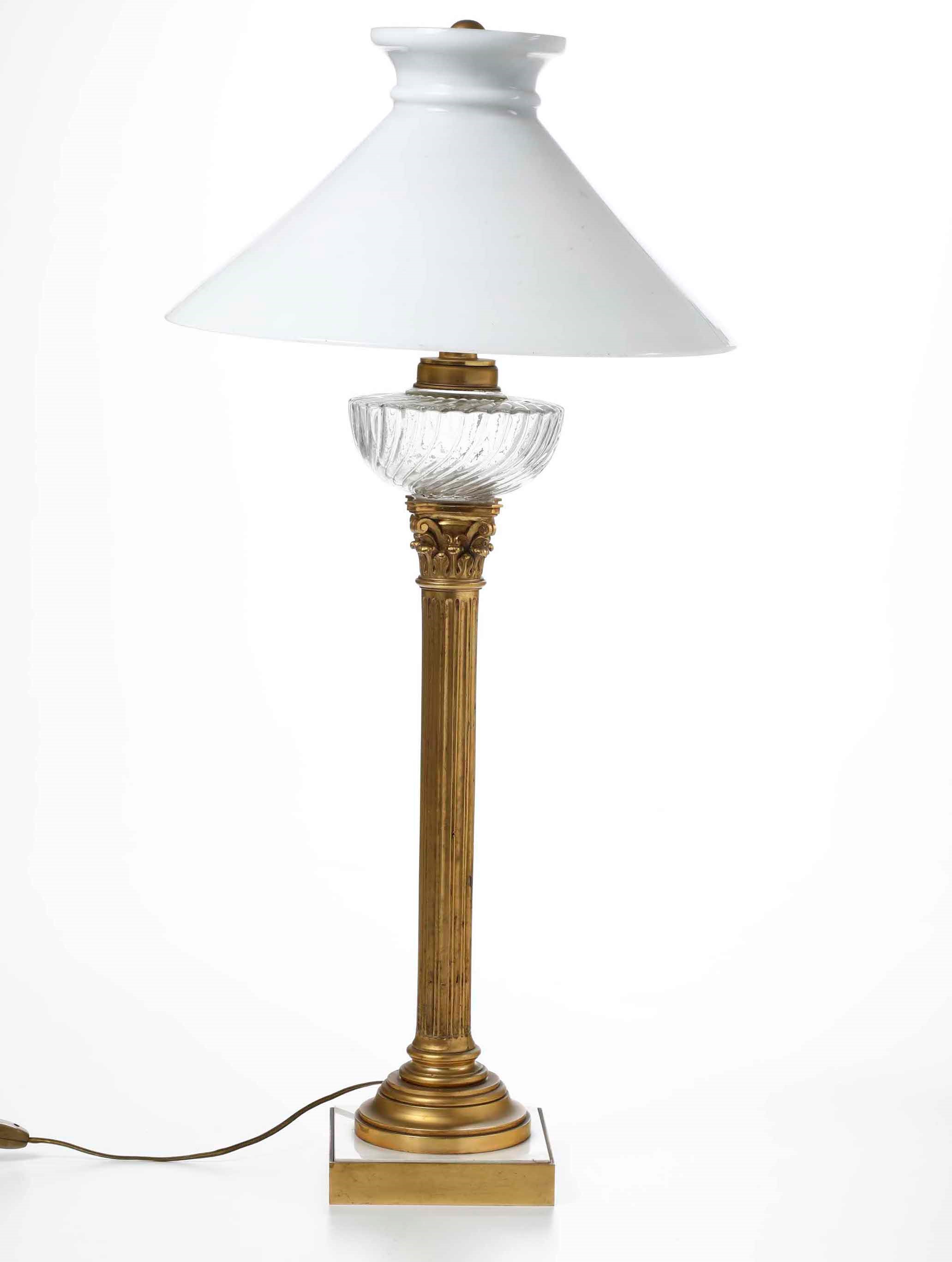 Coppia di lampade a colonna in ottone dorato. XX secolo