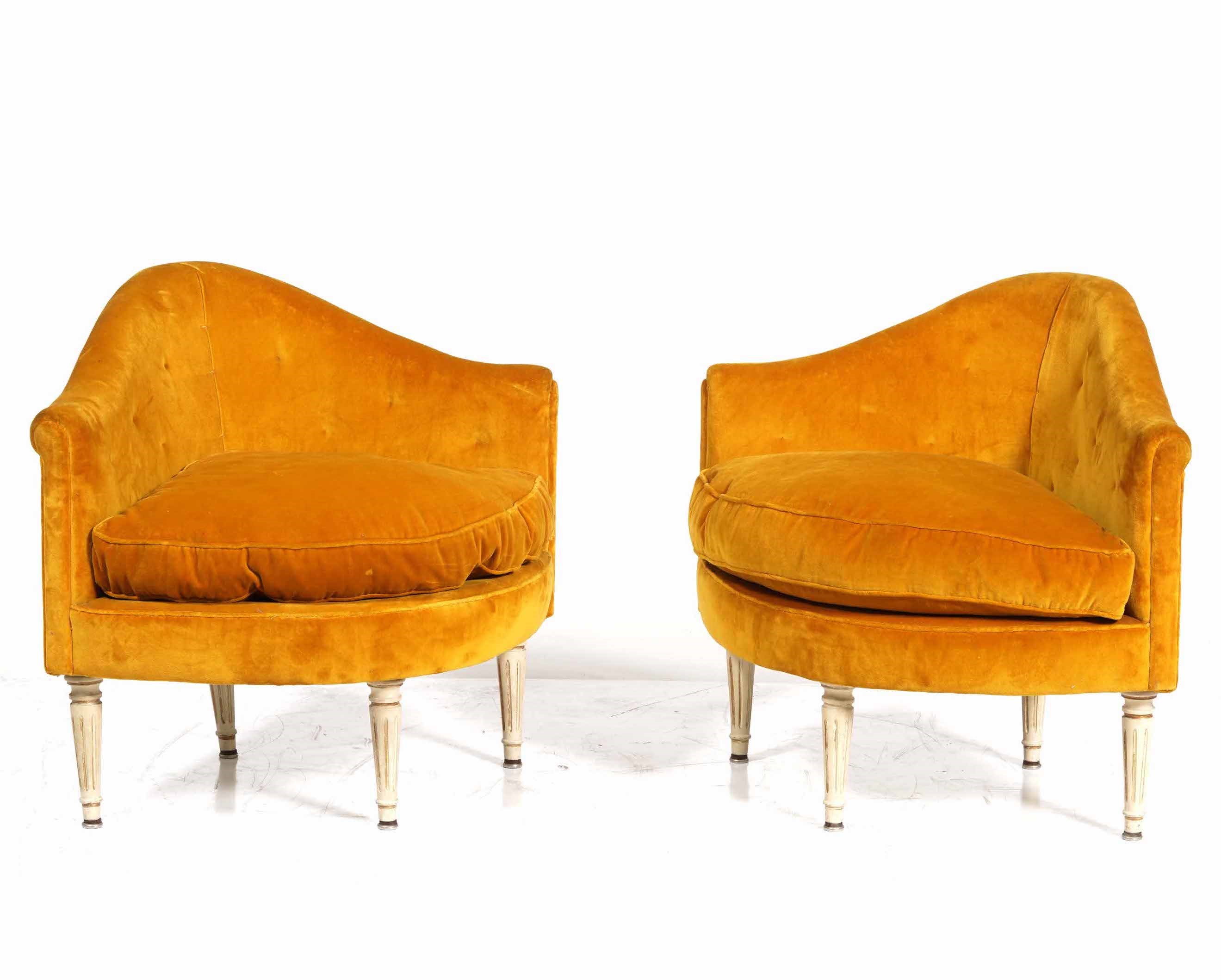 Coppia di poltrone ad angolo imbottite rivestite in velluto ocra. XX secolo