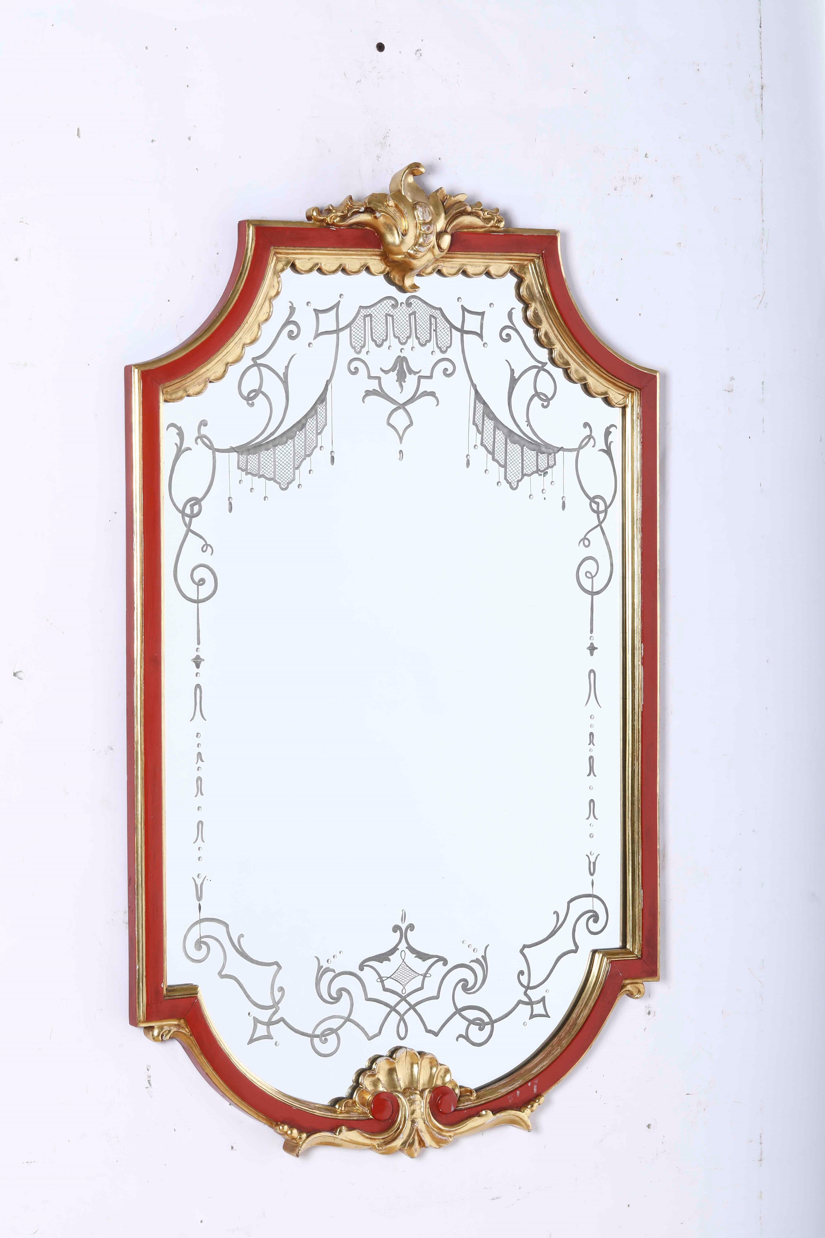 Coppia di specchiere in legno intagliato, laccato e dorato, specchi incisi. XIX [..]