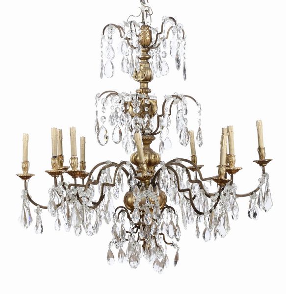 Lampadario in legno intagliato e dorato e cristalli. Genova XVIII secolo