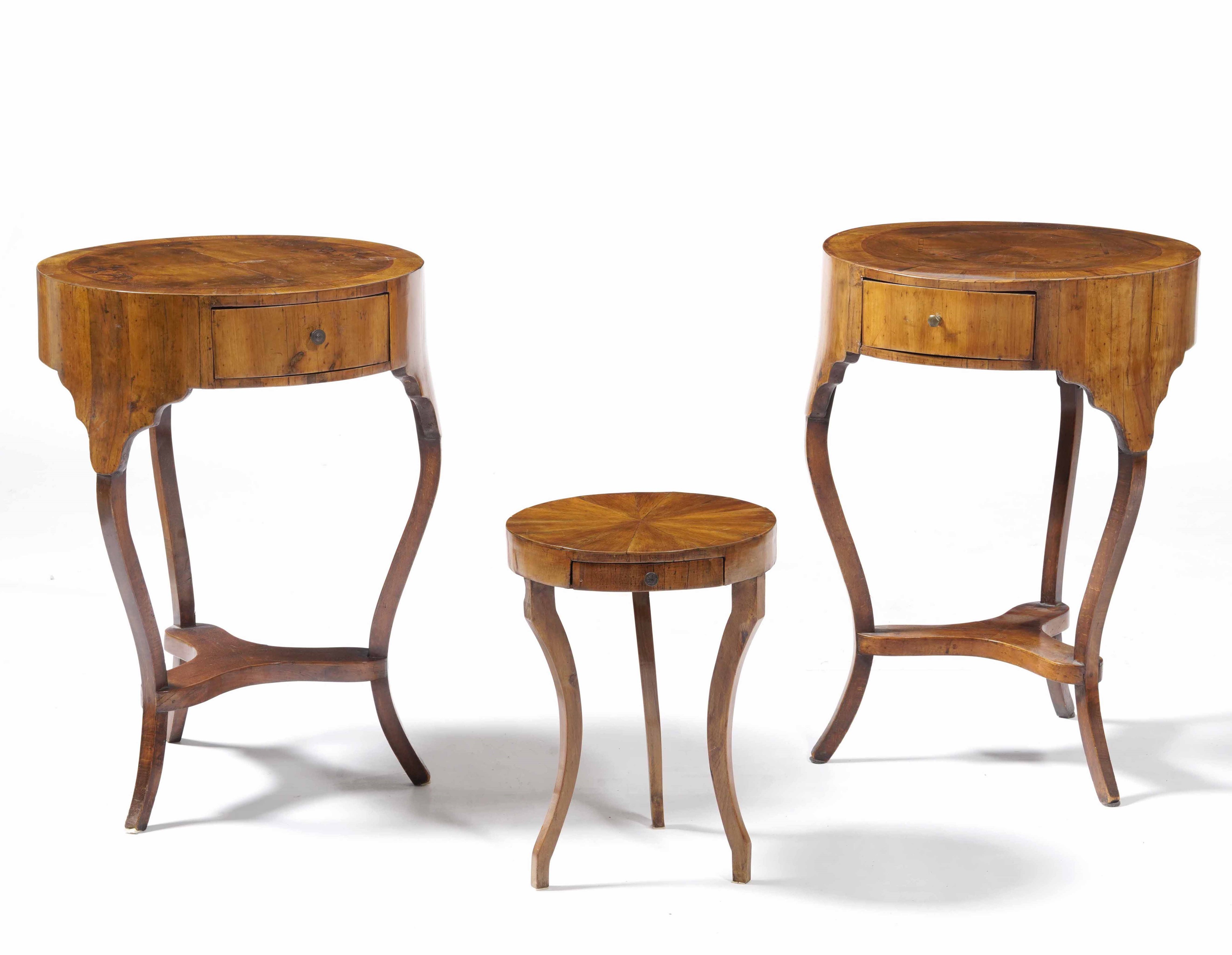 Lotto composto da una coppia di tavolini tondi con cassetto e un piccolo tavolino [..]