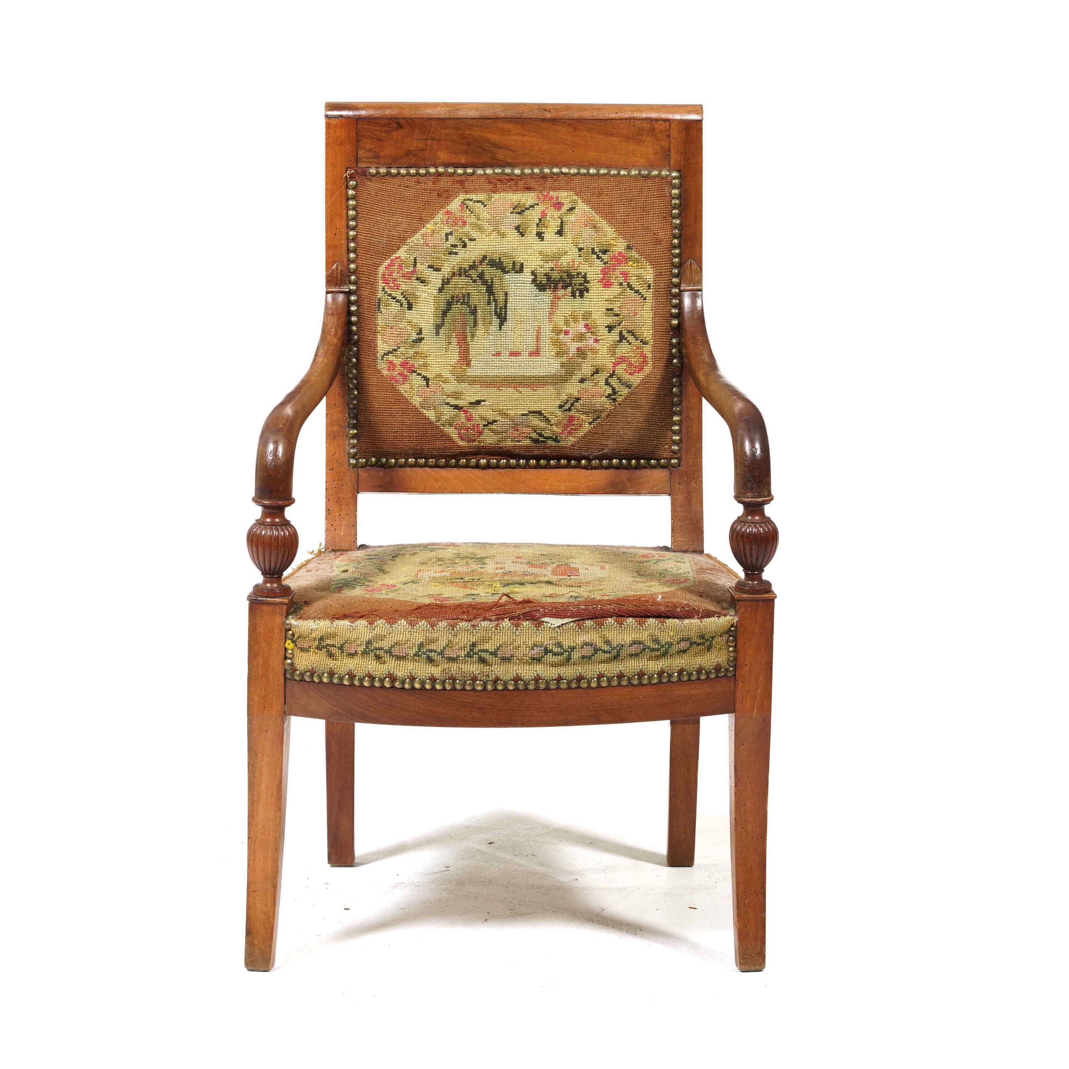 Poltrona in noce ricoperta da piccolo punto. Francia, XIX secolo