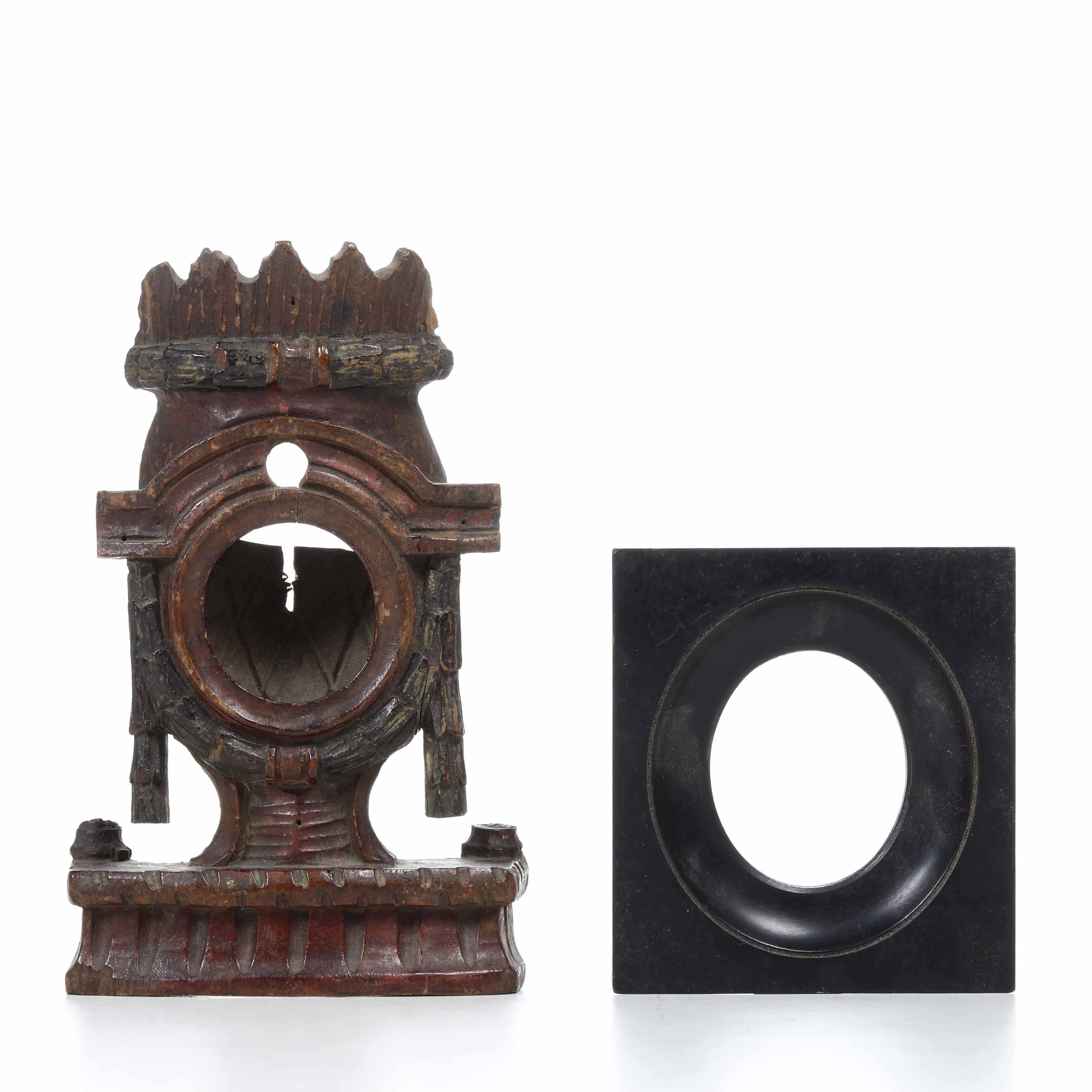Portaolologio in legno scolpito e piccola cornice ebanizzata