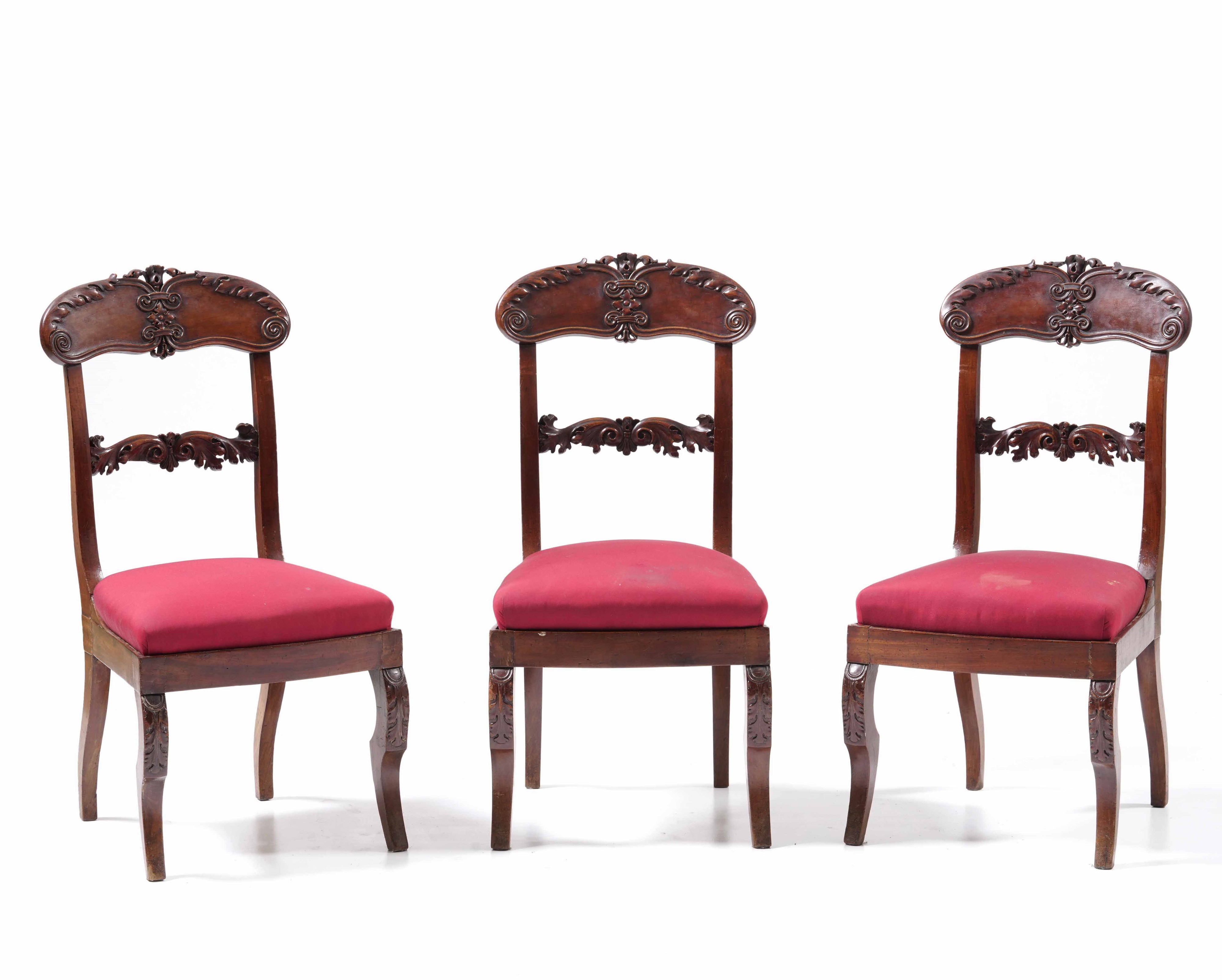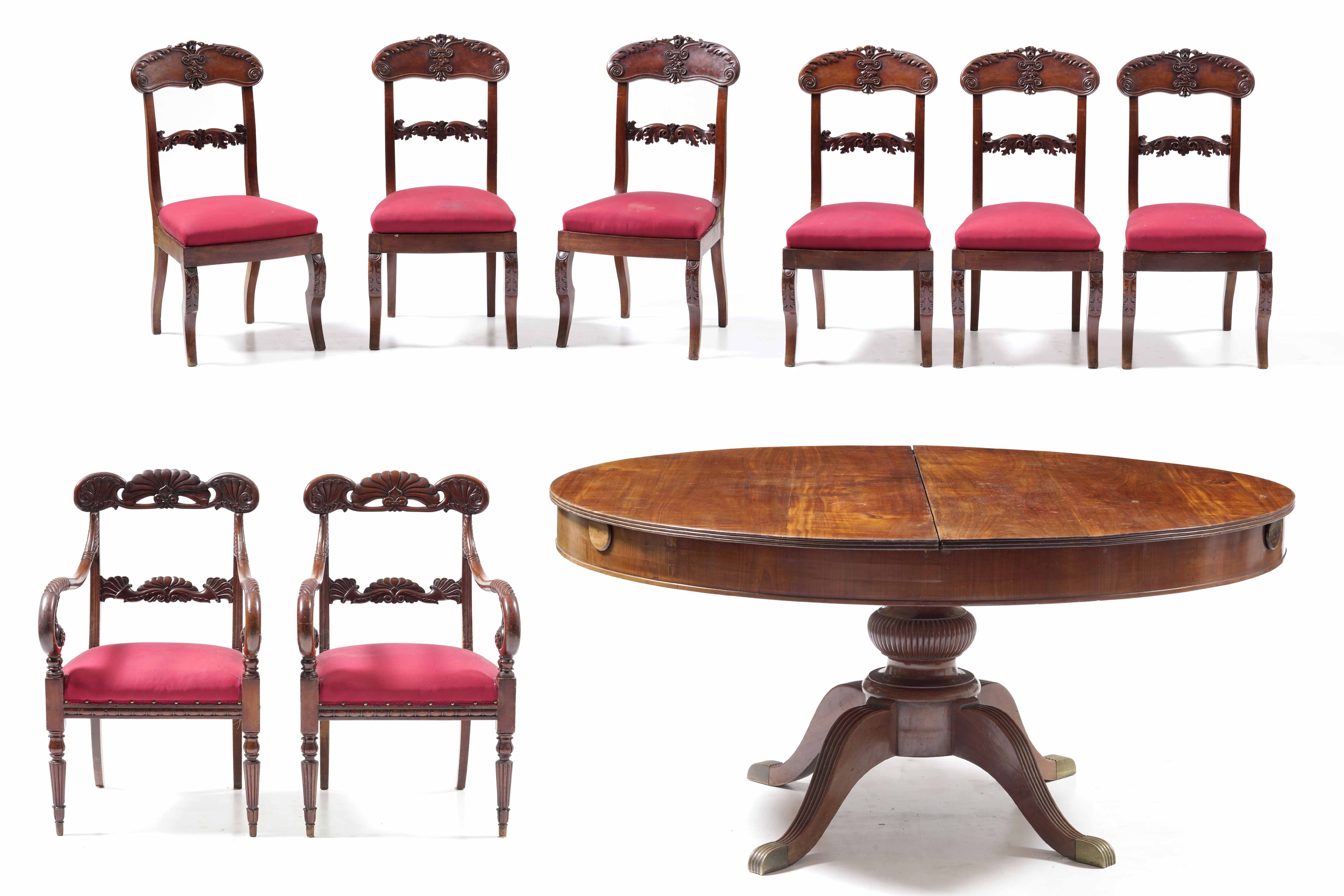 Tavolo in legno con sei sedie e due poltrone in legno intagliato. XIX secolo