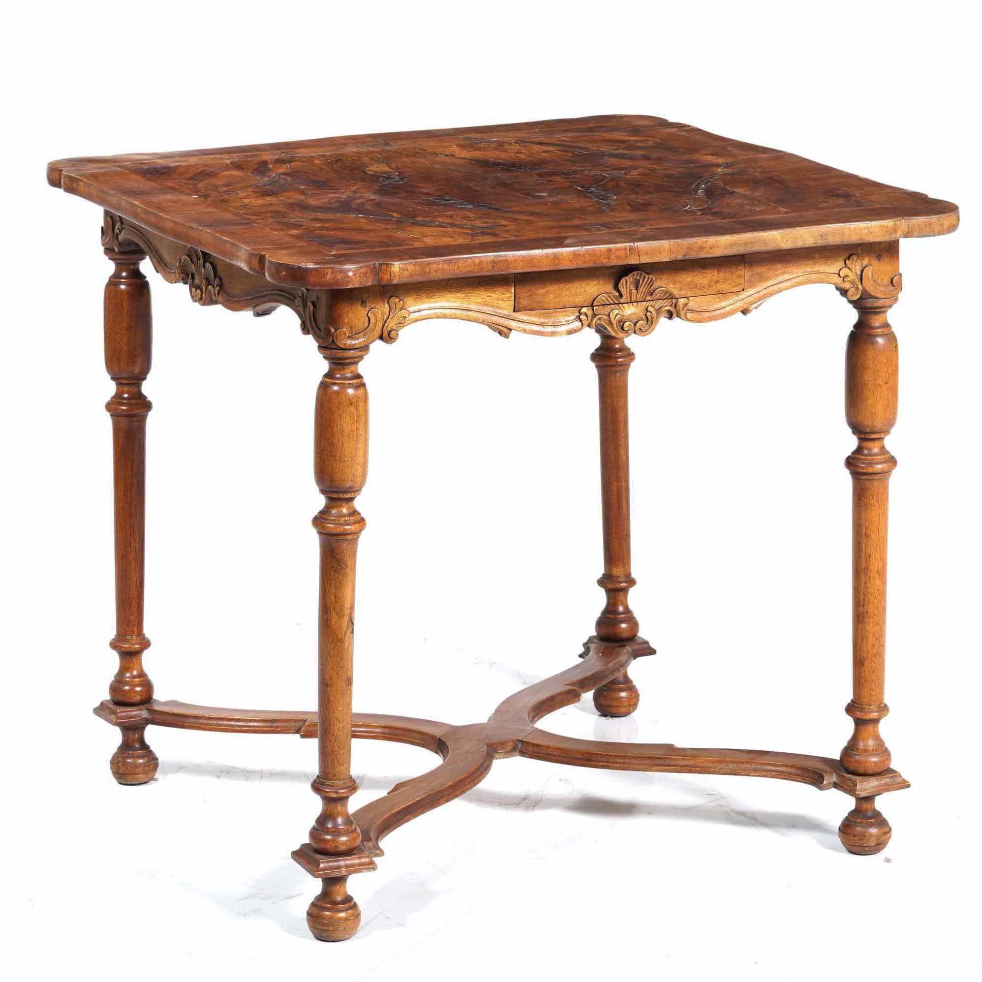 Tavolo in legno intagliato con piano lastronato in radica. XIX secolo