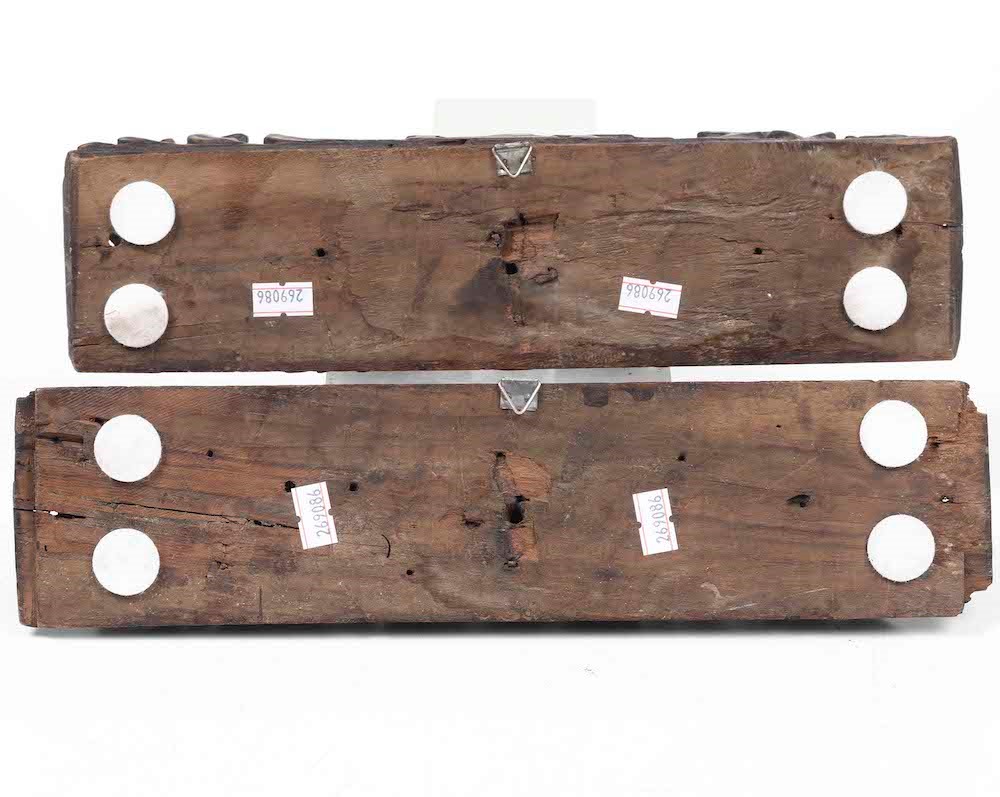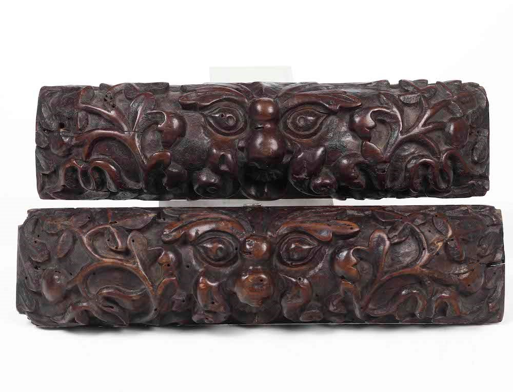Coppia di frammenti lignei in noce con mascheroni al centro. Alto Lazio, verso la [..]