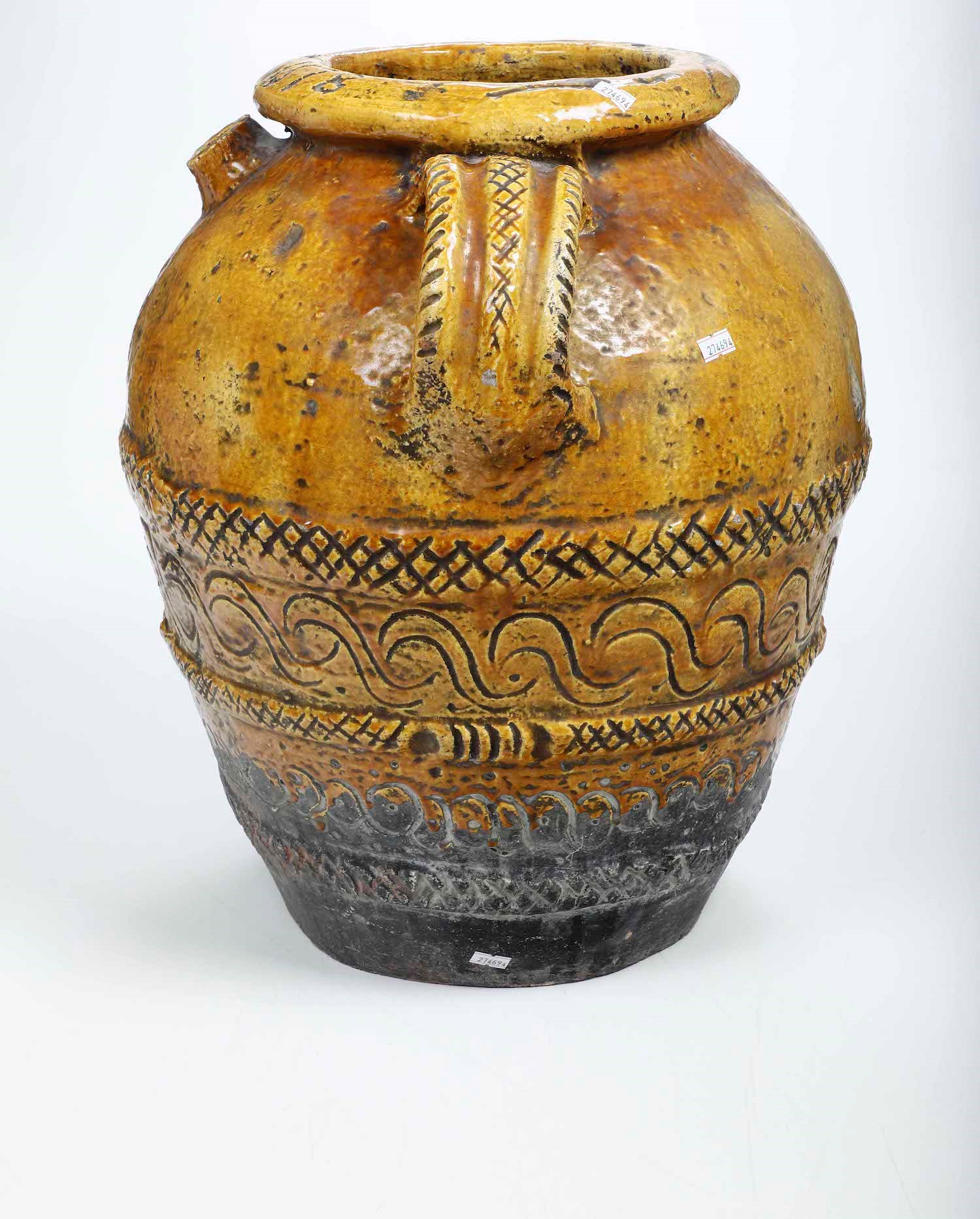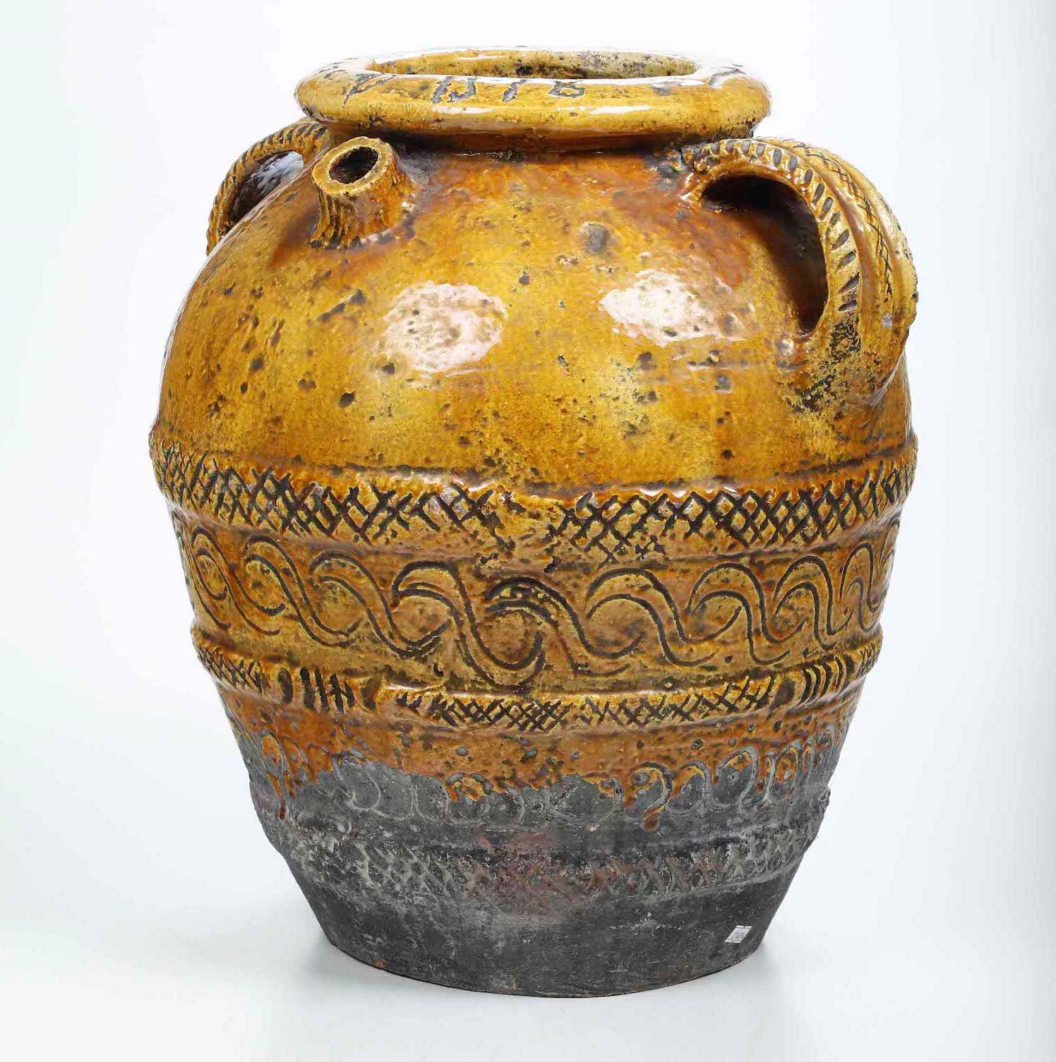 Orcio biansato con invetriatura gialla e decori a stecco