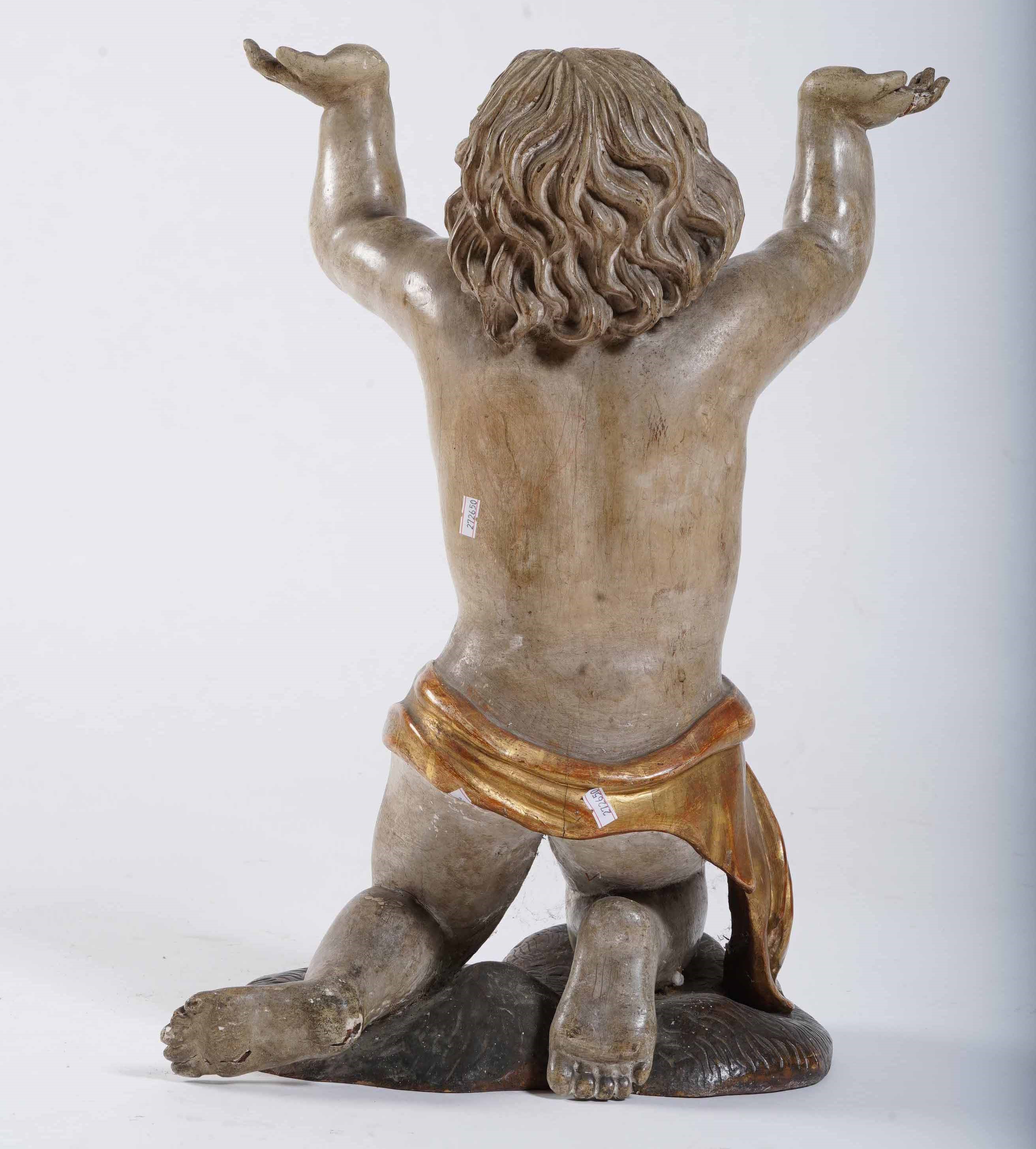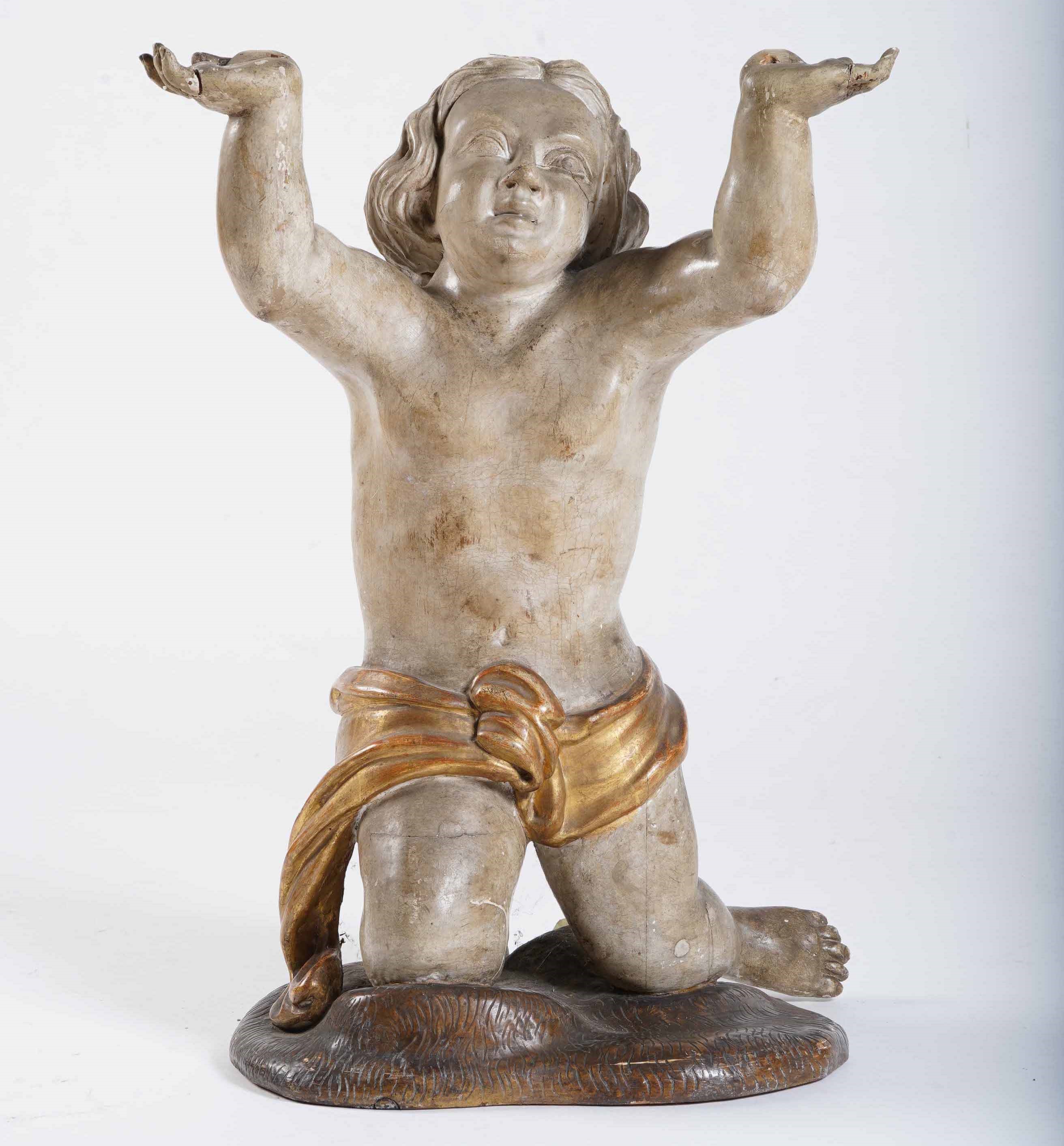 Putto inginocchiato. Legno dipinto e dorato. Arte barocca del XVII-XVIII secolo