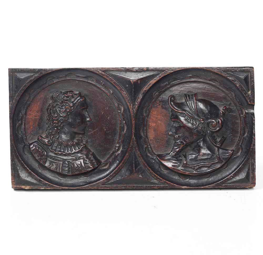 Rilievo ligneo in noce con doppio ritratto entro unico pannello scolpito. Piemonte [..]