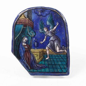 Antica piastra di Limoges dipinta e dorata raffigurante Annunciazione