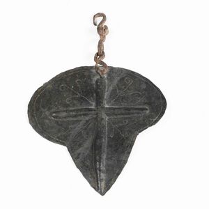 Foglia in rame sbalzato e punzonato, con al centro una croce attorniata da motivi [..]