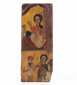 Piccolo pannello ligneo dipinto con la scena del Cristo benedicente con altre figure. [..]