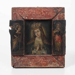 Piccolo altarolo ligneo da viaggio apribile a due sportello. Messico, XVIII sec [..]
