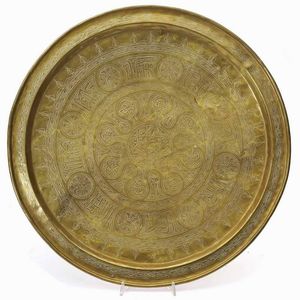 Piatto in ottone inciso. Arte mediorientale del XIX secolo
