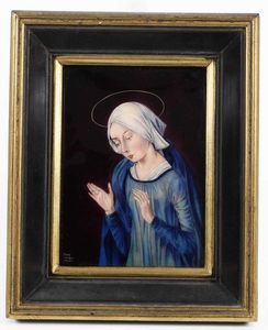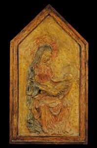 Bassorilievo in legno dipinto raffigurante Madonna con Bambino, nei modi della scultura [..]