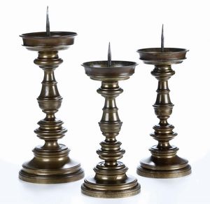 Lotto di tre candelieri in bronzo dorato in stile tardo gotico (datati 1934). Fonditore [..]