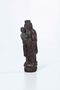 Bassorilievo in legno dipinto raffigurante Madonna con Bambino, nei modi della scultura [..]