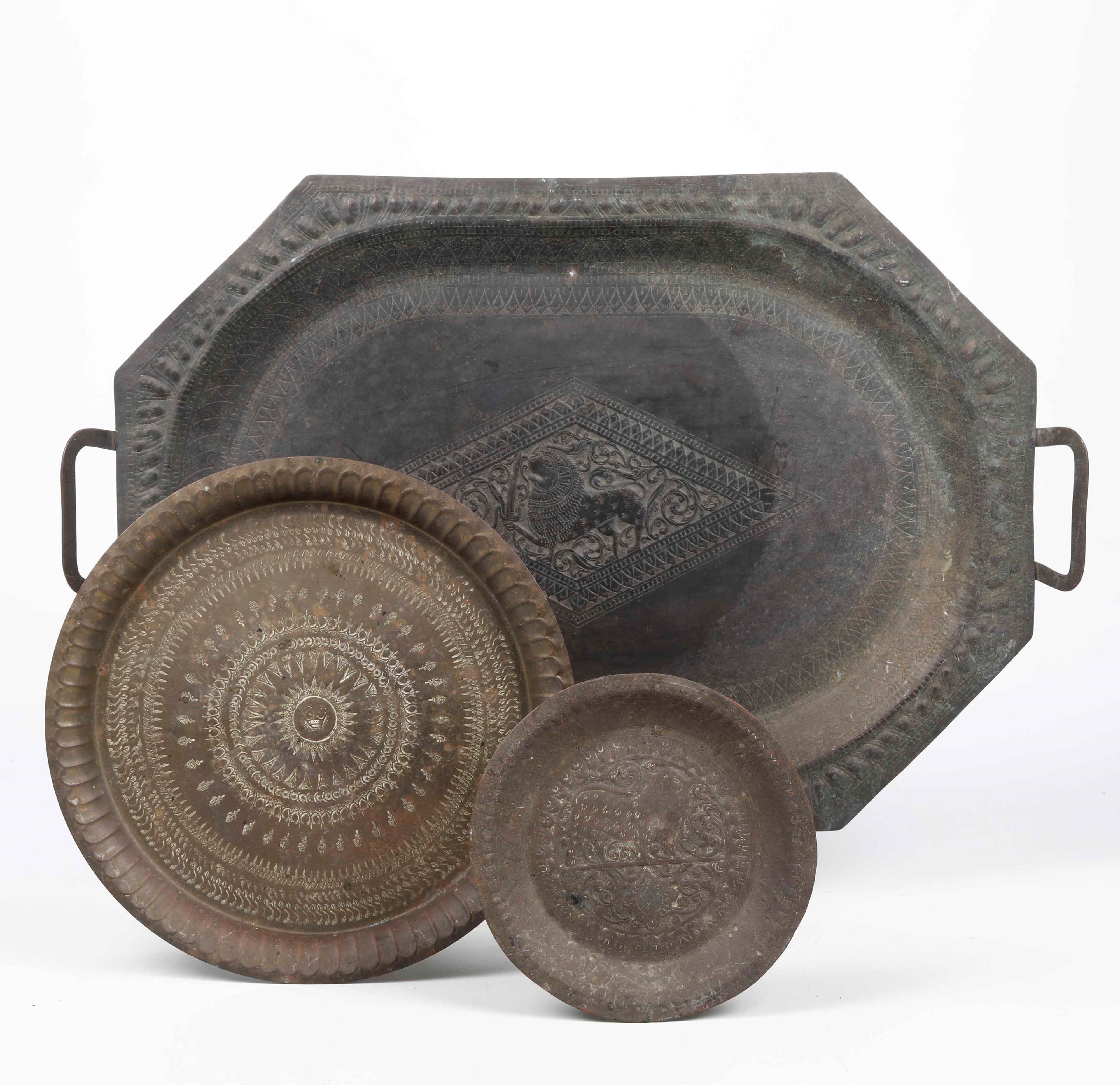 Un vassoio e due piatti in ottone sbalzato e cesellato. Arte del vicino oriente [..]