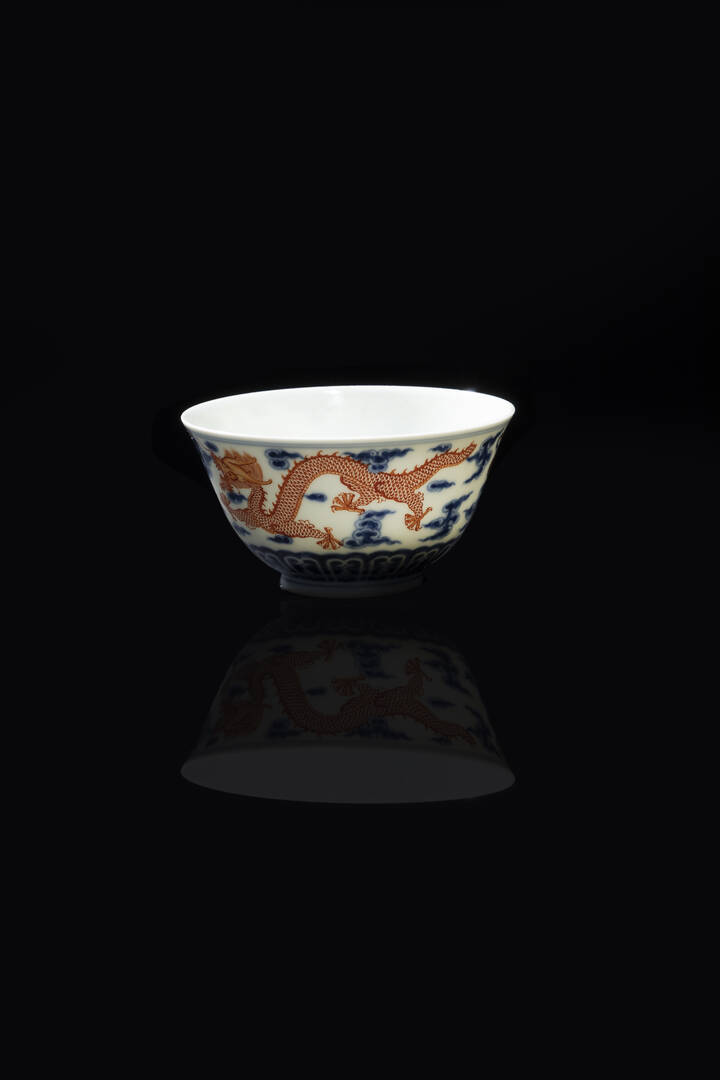Coppetta in porcellana bianco e blu con draghi rossi Cina Repubblica XX sec. [..]